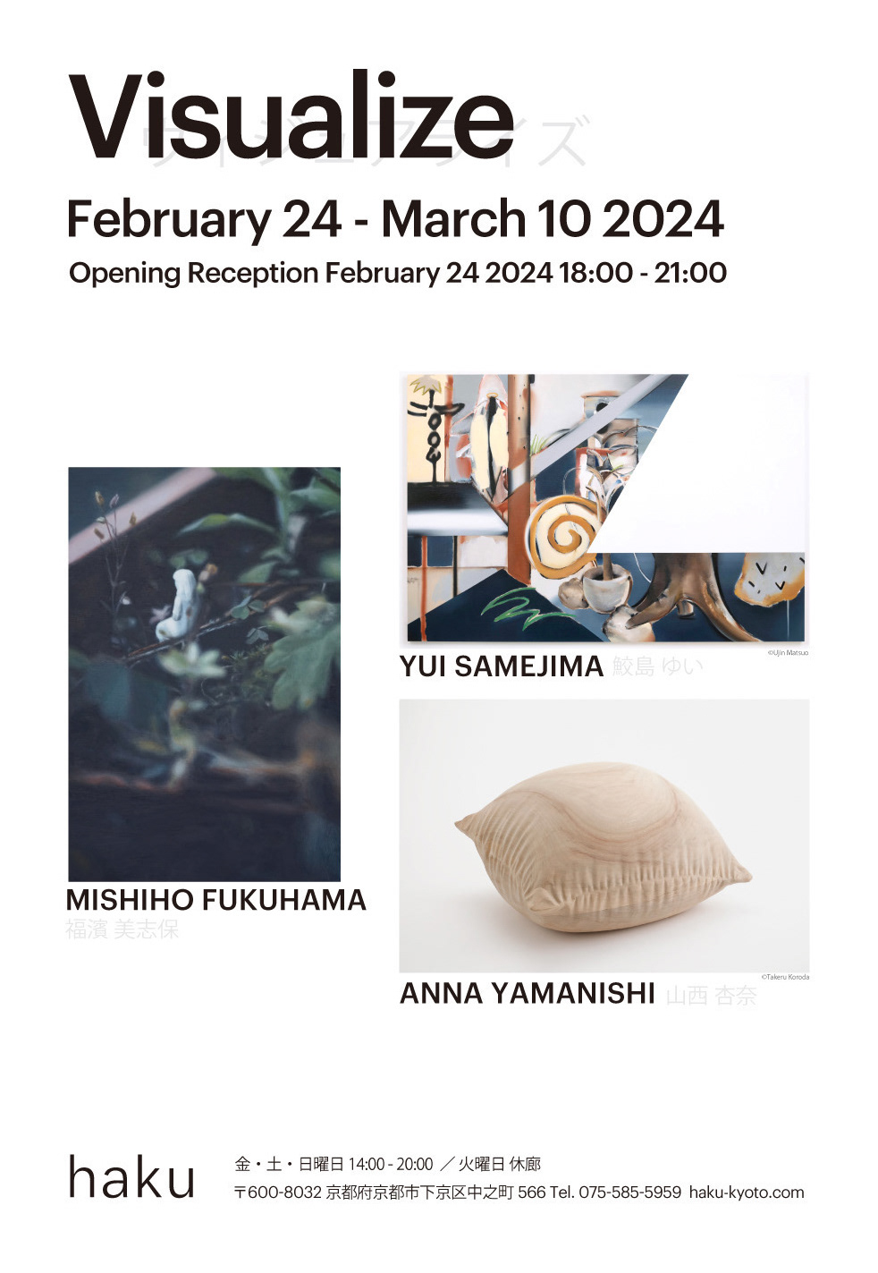 haku kyoto では鮫島 ゆい、福濱 美志保、山西 杏奈の 3 名による展覧会「Visualize」を開催いたします。